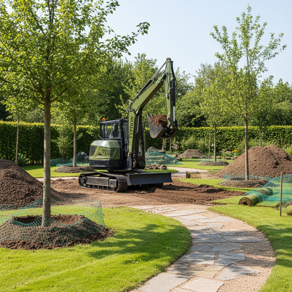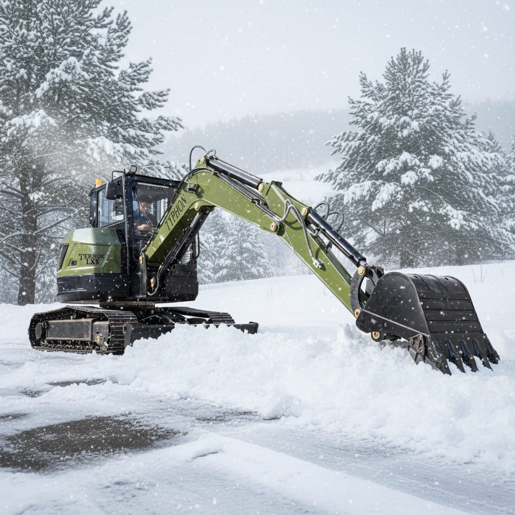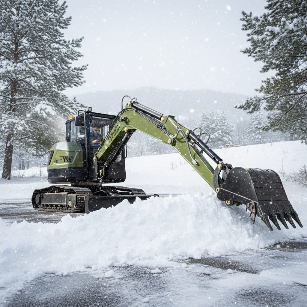 Despite weighing 6.6 tons, the TYPHON TERROR LXV excels in tight spaces like gardens, sidewalks, fence lines, and construction rows. Its powerful Kubota engine ensures strong digging force, smooth hydraulics, and reliable performance for construction, agriculture, and material handling. Measuring 5834 mm long, 2000 mm wide, and 2570 mm high, with a boom-swing system, it combines agility, stability, and precision in confined areas.
